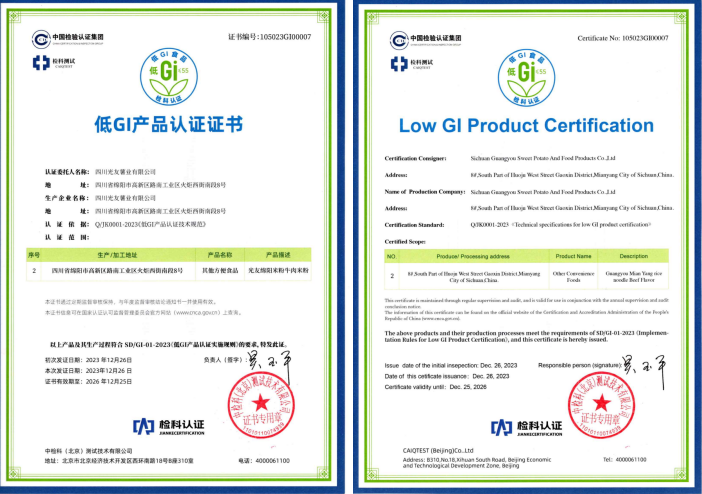 光友32年打造薯類方便主食健康品質:光友薯業(yè)32年來,專做健康薯業(yè),在中國乃至世界把紅薯、馬鈴薯做成一大健康主食產(chǎn)業(yè)。光友薯業(yè)歷經(jīng)32年來,光友綿陽米粉低GI健康方便主食發(fā)布,是繼光友酸辣粉低GI健康方便主食后,又一個健康爆款產(chǎn)品上市。光友低GI健康薯類方便主食是經(jīng)光友薯業(yè)技術創(chuàng)新,經(jīng)國家權威檢測機構營養(yǎng)成分檢測和臨床試驗,取得低GI食品報告,由中國權威認證機構中檢科檢測后,為光友薯業(yè)頒發(fā)了光友綿陽米粉低GI健康方便主食認證證書,這是線上線下各位領導、嘉賓、朋友,關心支持光友32年來共同取得的成果!