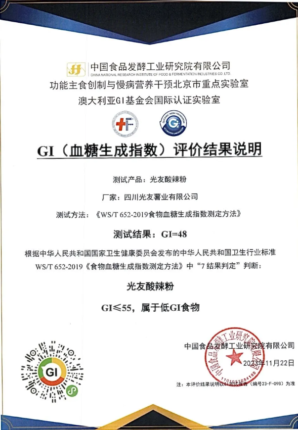 4月23日訊:近日,光友薯業(yè)收到來自中國食品發(fā)酵工業(yè)研究院GI營養(yǎng)工作室的喜訊,光友薯業(yè)生產(chǎn)的明星產(chǎn)品——光友酸辣粉成功通過中國食品發(fā)酵工業(yè)研究院GI國際聯(lián)合研究與測試實(shí)驗(yàn)室標(biāo)準(zhǔn)化GI測試流程,被認(rèn)證為低GI食物。