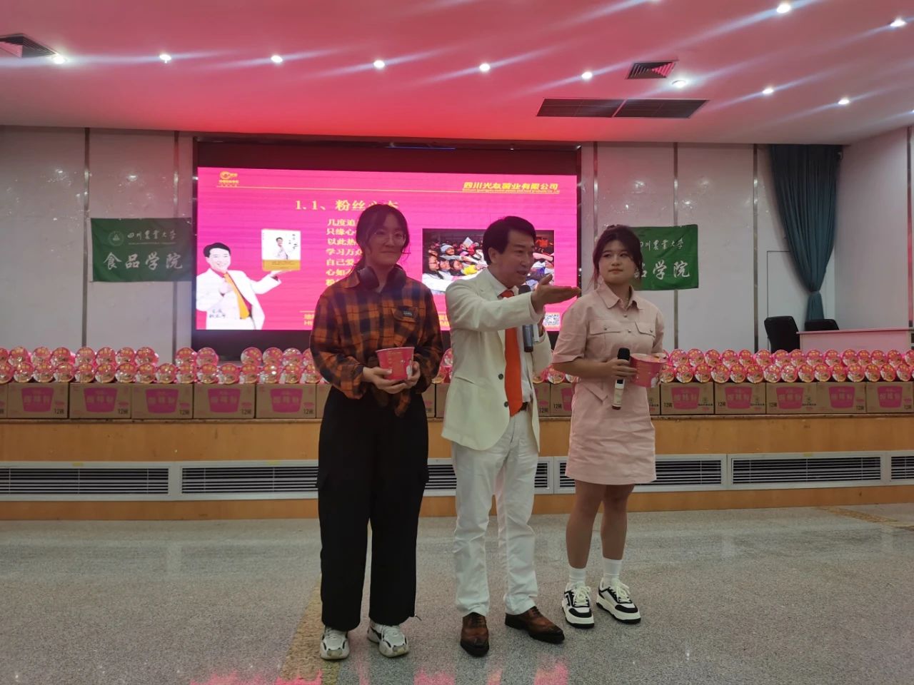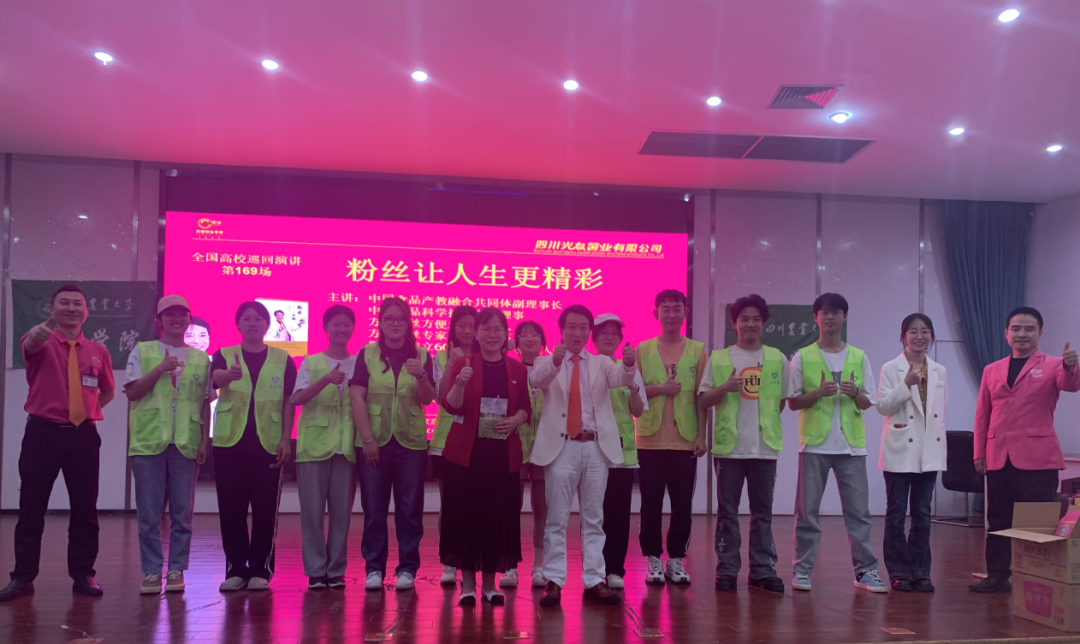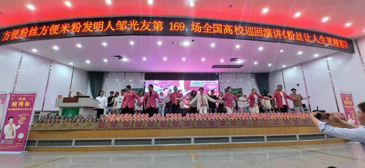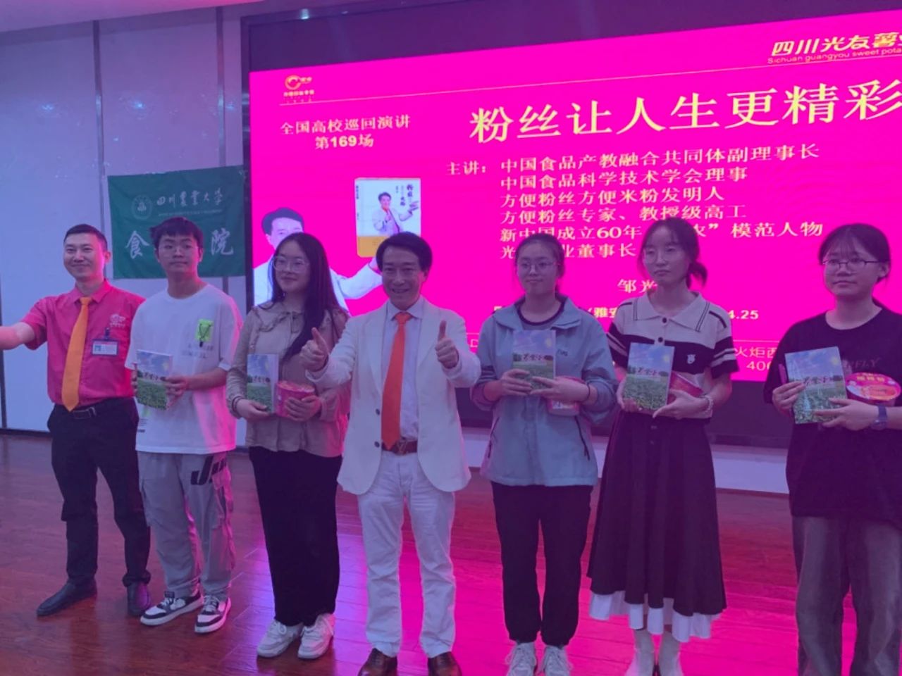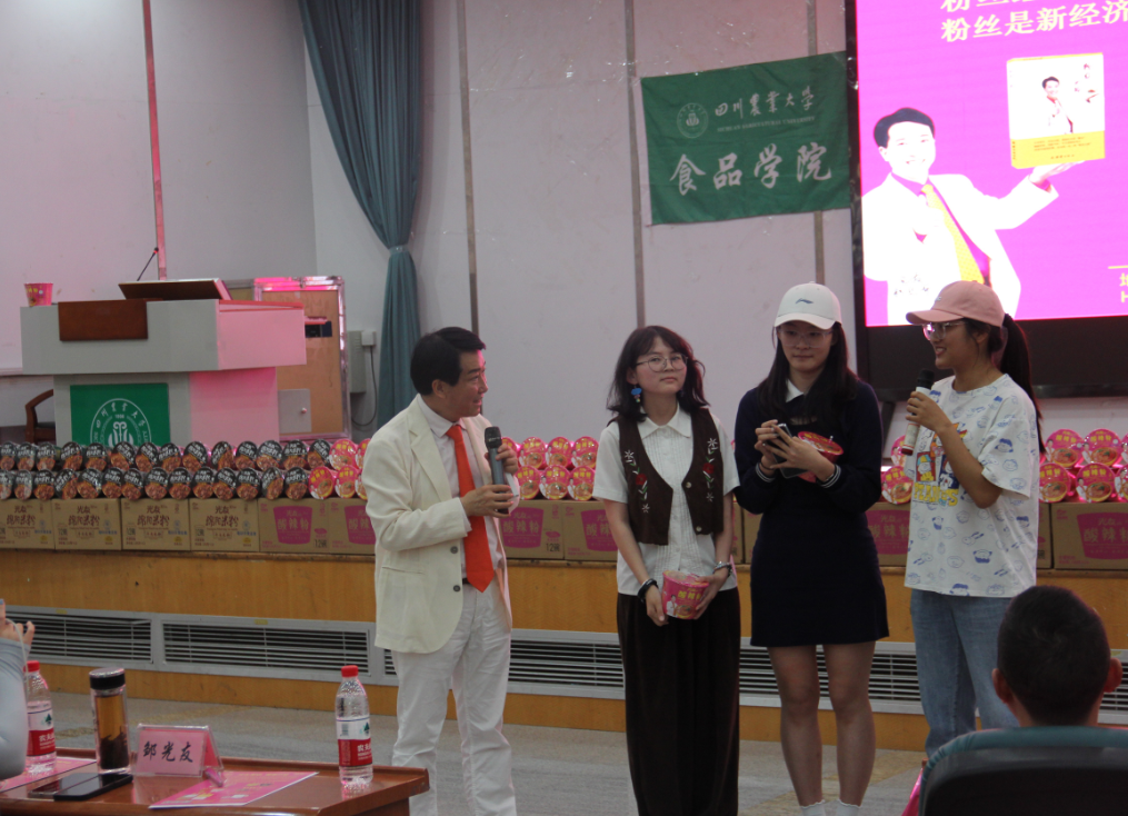 下午三時許,中國食品產教融合共同體副理事長、中國食品科學技術學會理事、方便粉絲方便米粉發(fā)明人、方便粉絲專家、教授級高工、新中國成立60年“三農”模范人物、光友薯業(yè)創(chuàng)始人、光友薯業(yè)董事長鄒光友在四川農業(yè)大學食品學院如期舉行全國高校巡回演講第169場——《粉絲讓人生更精彩》,這場關于創(chuàng)業(yè)的勵志演講大獲成功,近700人的禮堂現(xiàn)場一片歡騰,在座師生和直播間的觀眾無不受益良多。