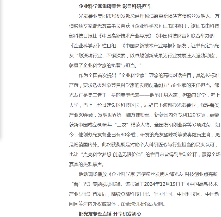 轉載中國食品新聞網-方便粉絲發(fā)明人鄒光友獲《企業(yè)科學家》榮譽稱號