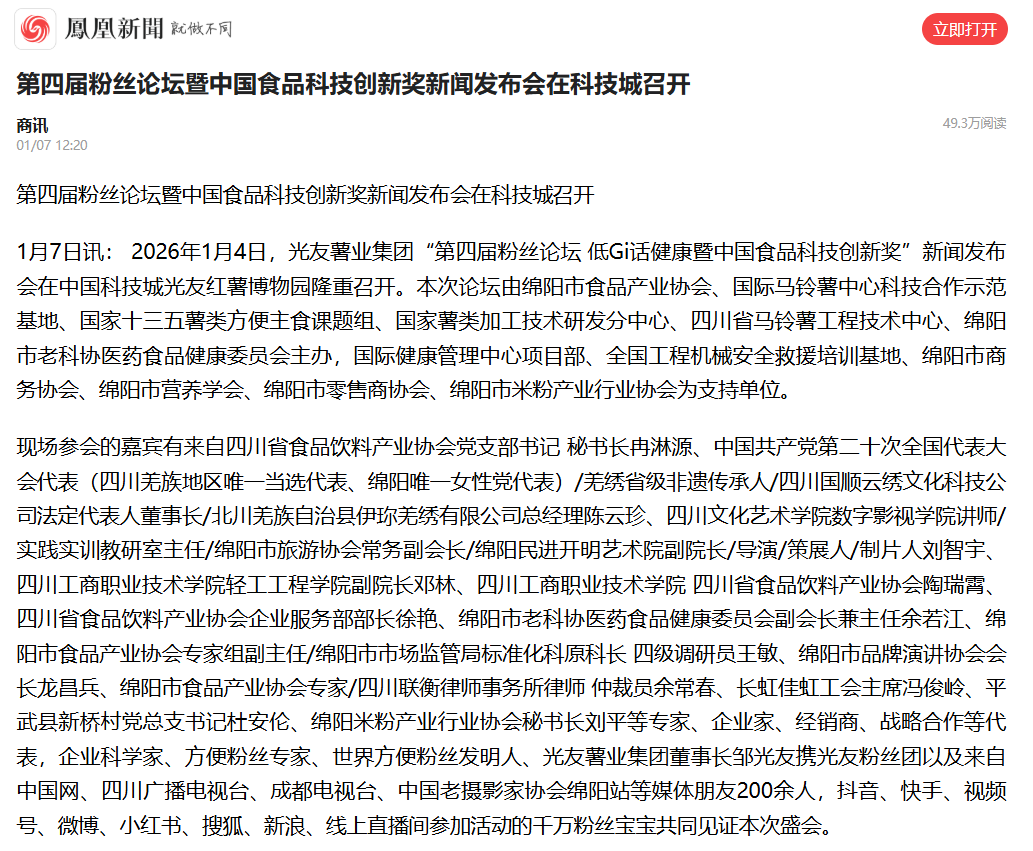 轉(zhuǎn)載鳳凰網(wǎng) 第四屆粉絲論壇暨中國(guó)食品科技創(chuàng)新獎(jiǎng)新聞發(fā)布會(huì)在科技城召開